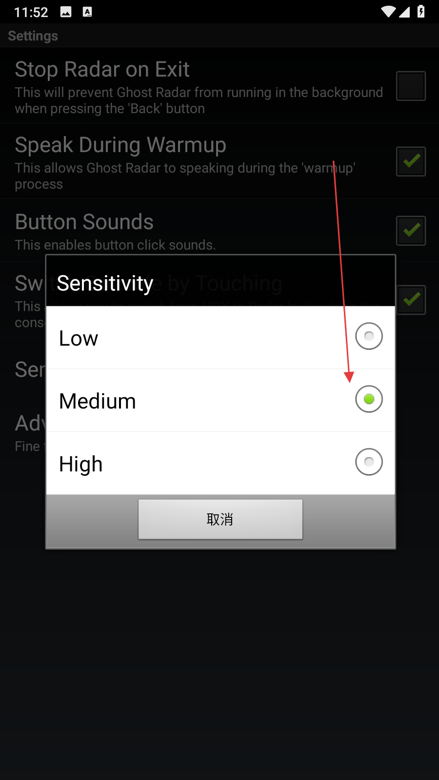 4、在彈出的靈敏度選擇彈窗里,根據(jù)實際需求選擇靈敏度,點擊對應(yīng)的選項,完成靈敏度的調(diào)整。