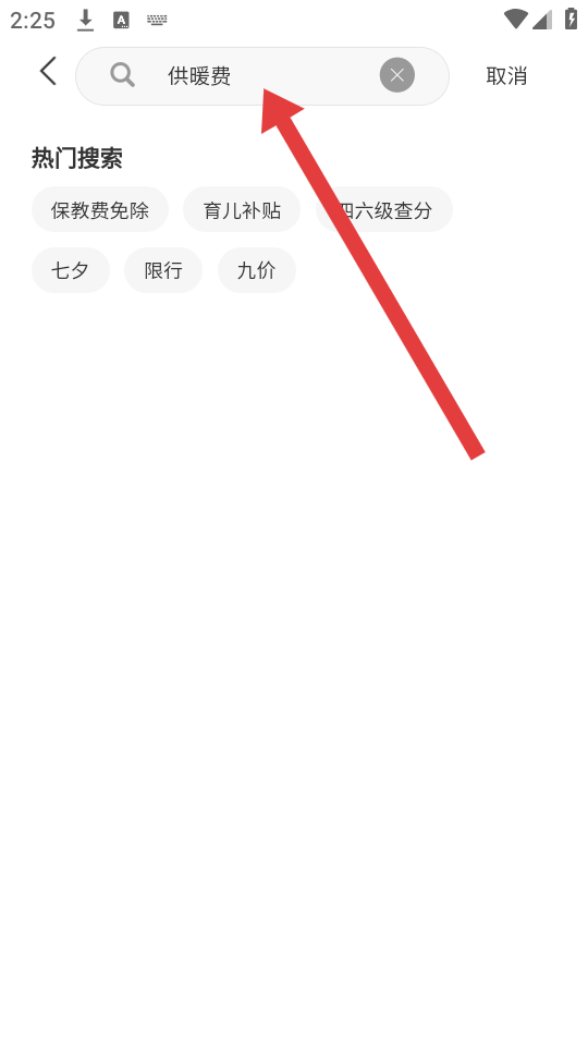 1、打開沈陽本地寶,在主頁的搜索欄輸入供暖費并點擊搜索,開啟沈陽供暖繳費信息查詢流程。