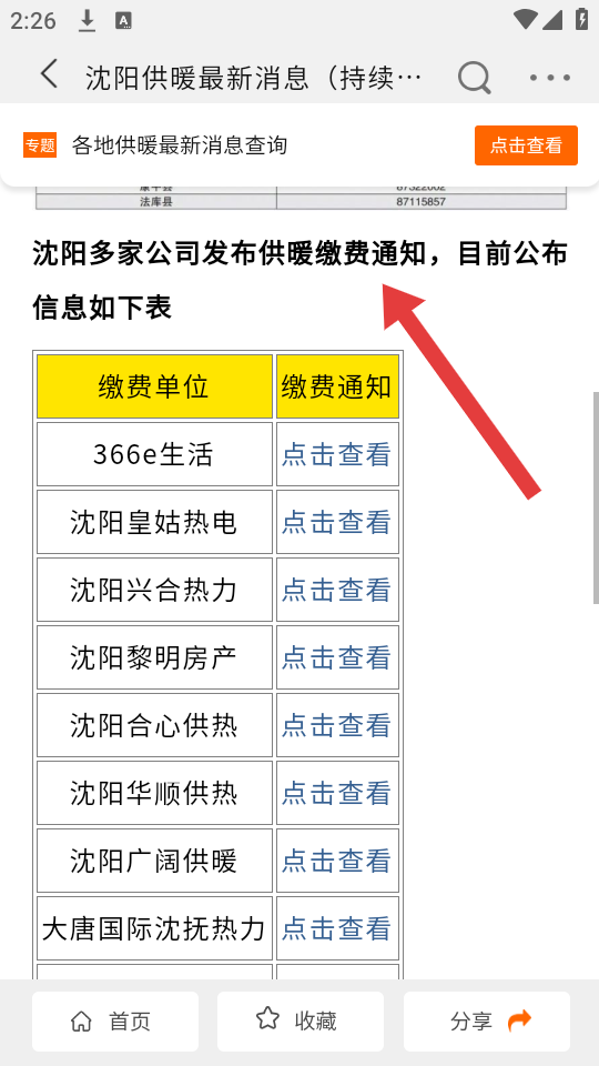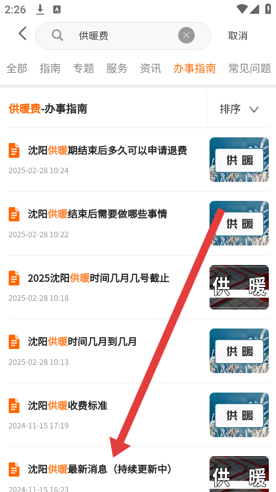 2、在搜索結(jié)果里,選擇沈陽供暖最新消息持續(xù)更新中等辦事指南條目,進入頁面查看各供暖公司繳費詳情。