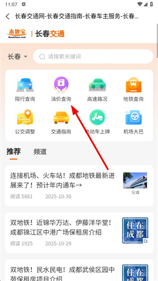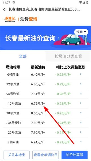 3、進入油價查詢頁面后,即可查看長春最新的各類燃油標號的油價信息,包括最新油價及相比上次調(diào)整的漲跌情況。