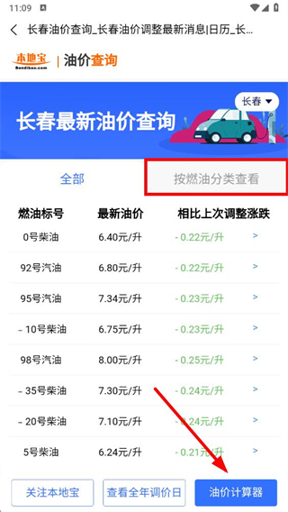 4、還可點擊按燃油分類查看或使用油價計算器等功能進一步操作。