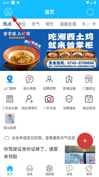 1、在掌上湘西app首頁點擊左上角個人圖標,進入我的頁面。