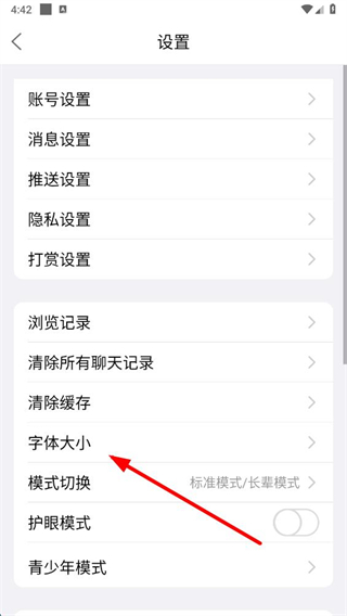 3、在設置頁面點擊字體大小選項,進入字體大小設置頁面。