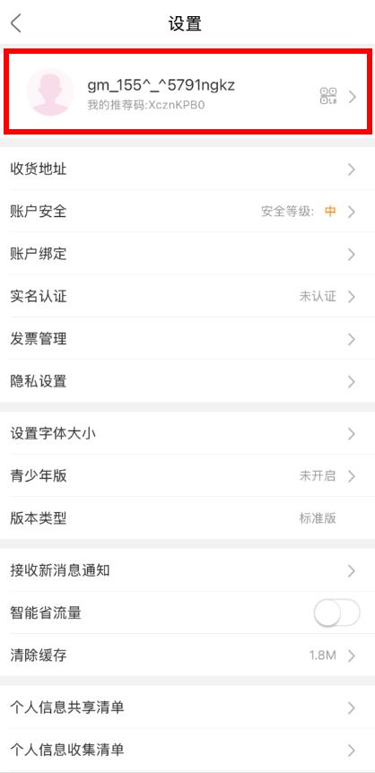 3、進入設(shè)置頁面后,點擊頭像及用戶名區(qū)域,進入個人信息頁面。