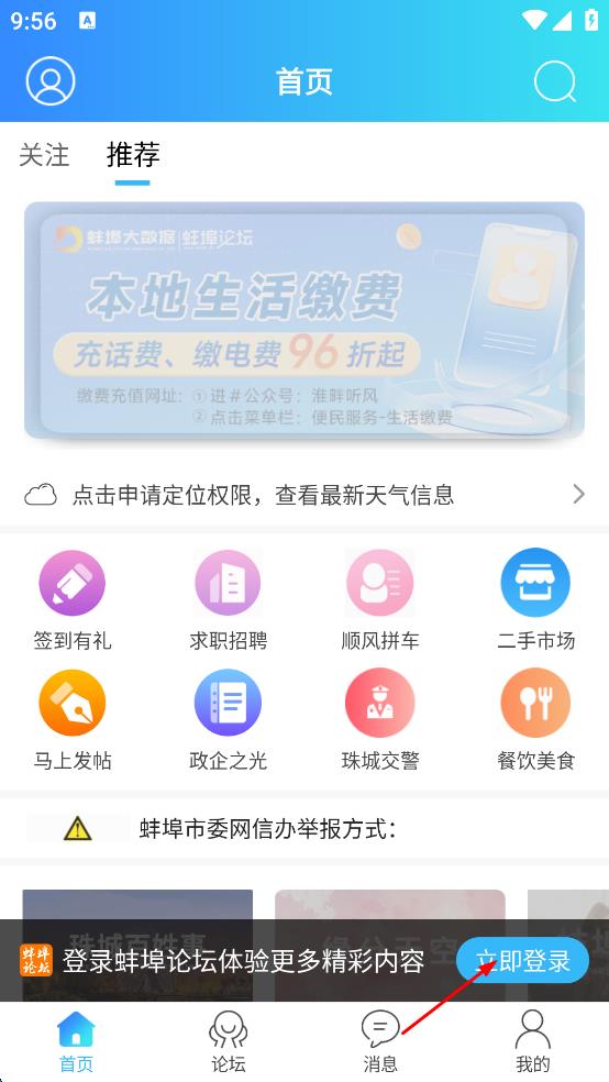 2、進(jìn)入APP首頁后,點擊頁面下方的“立即登錄”按鈕。