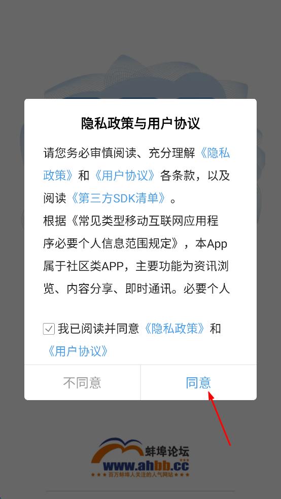 1、打開蚌埠論壇APP,會彈出隱私政策與用戶協(xié)議提示框,點擊“同意”按鈕。
