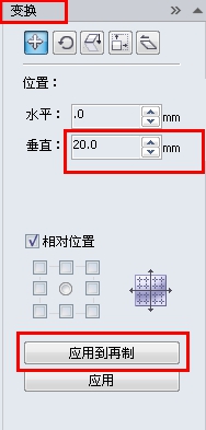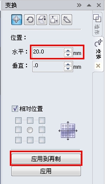 再在變換面板的位置選項上輸入需要變換的距離,比如水平方向要移動多少,垂直方向要移動多少,輸入移動距離后,選面板中的“應(yīng)用到再制”,這樣我們就能根據(jù)規(guī)定距離進行復(fù)制。如我們要制作9mm直徑,中對中20mm的排孔,我們就可以先畫一個直徑為9mm的圓,再在變換面板輸入水平距離20,如圖