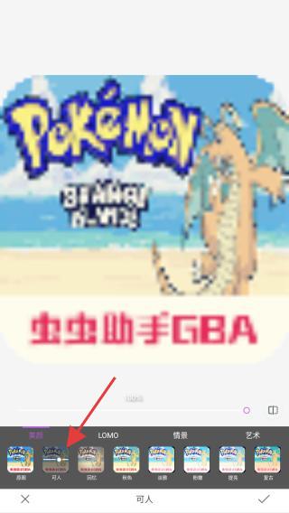 3、圖片導入后,底部會顯示美化分類標簽,如可人、LOMO、背景、藝術等,左右滑動可切換分類。