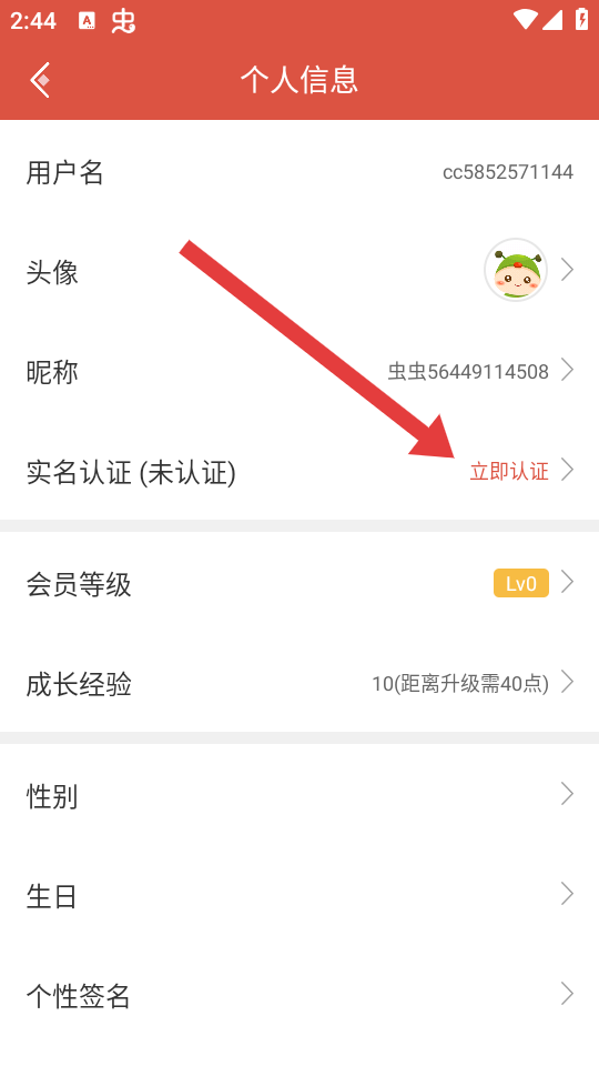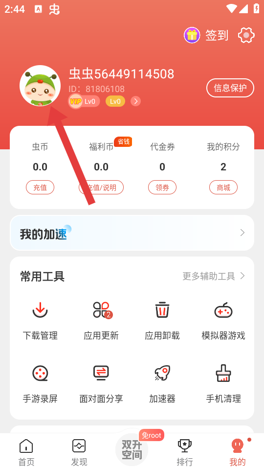1、打開蟲蟲助手APP,進(jìn)入我的的頁面,點(diǎn)擊頂部個(gè)人頭像區(qū)域,進(jìn)入個(gè)人信息頁面。