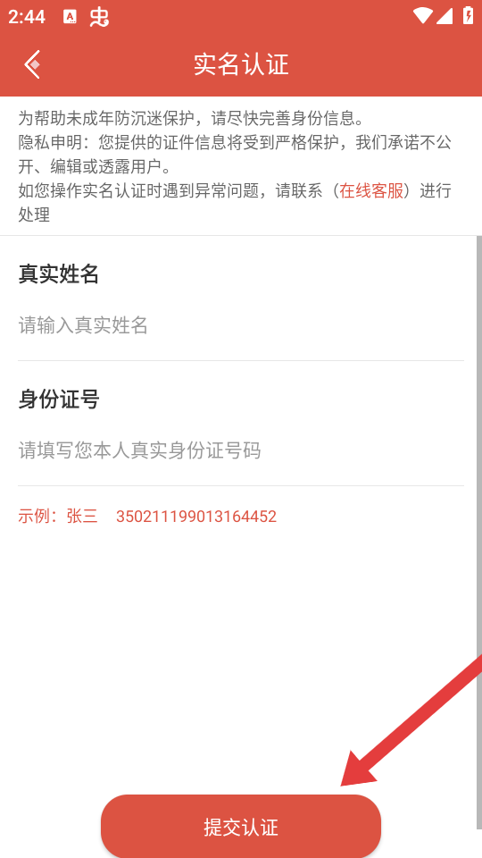 3、在實(shí)名認(rèn)證頁面填寫真實(shí)姓名、身份證號,確認(rèn)信息無誤后點(diǎn)擊底部提交認(rèn)證按鈕完成實(shí)名認(rèn)證。