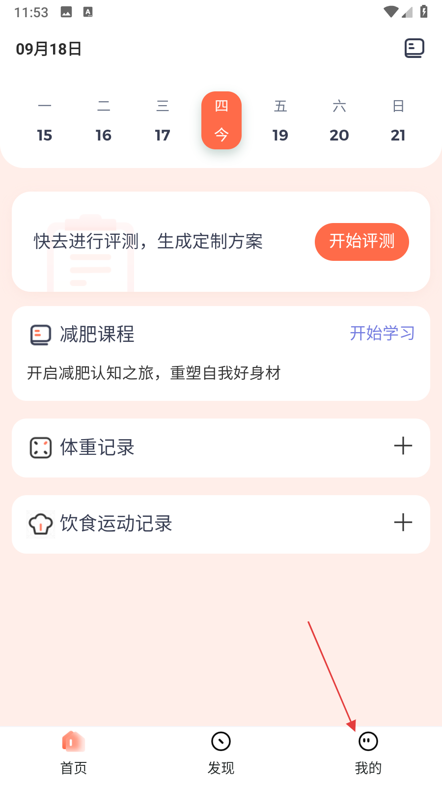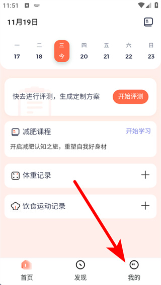1、打開(kāi)薄荷營(yíng)養(yǎng)師APP,點(diǎn)擊底部導(dǎo)航欄我的,進(jìn)入個(gè)人頁(yè)面。
