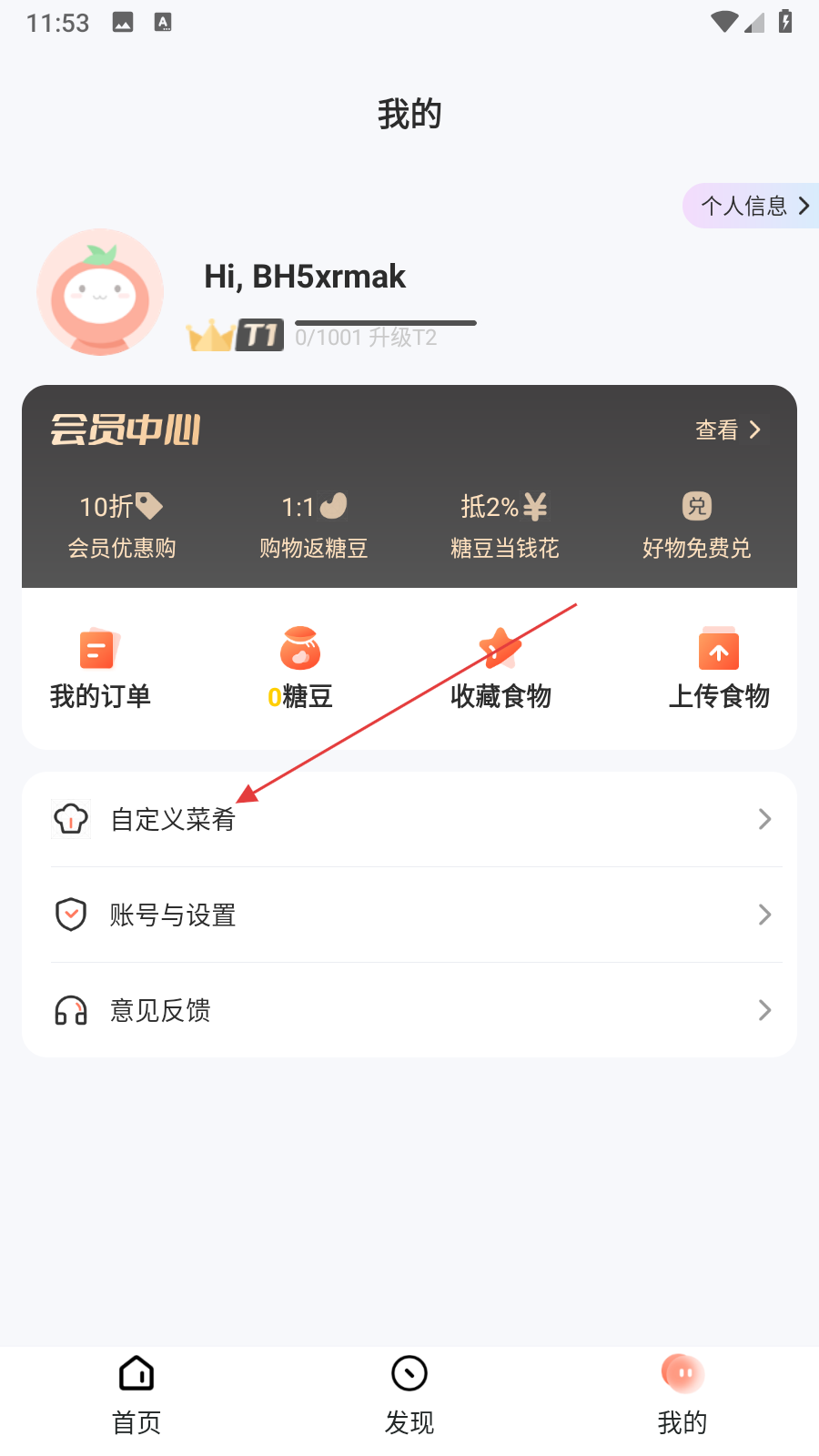 2、在個(gè)人頁(yè)面中,找到自定義菜肴選項(xiàng)并點(diǎn)擊,進(jìn)入自定義食物界面。
