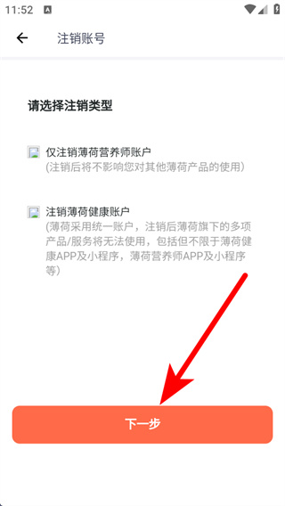 4、選擇注銷類型后點(diǎn)擊下一步,按提示完成賬號(hào)注銷操作。