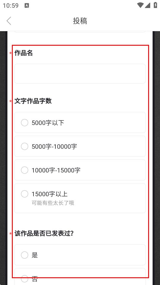 4、繼續(xù)填寫作品名,選擇文字作品字?jǐn)?shù),以及該作品是否已發(fā)表過(guò)。