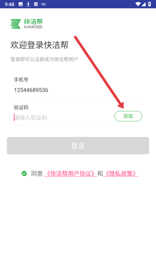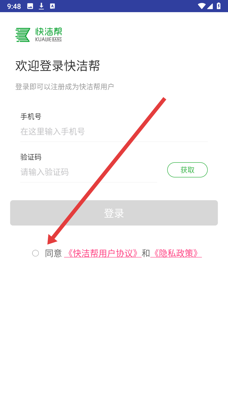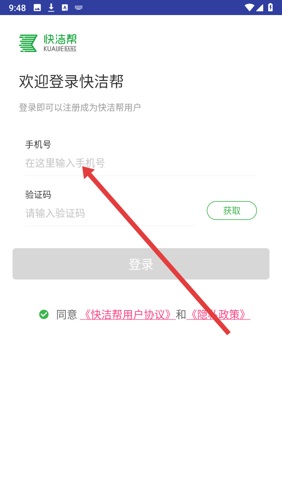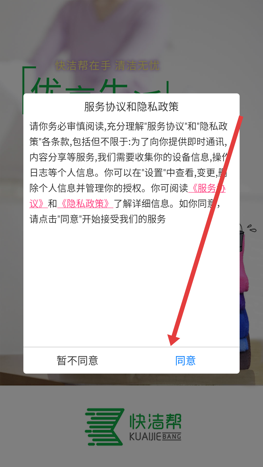 1、在打開快潔幫app后,點擊彈窗中的同意按鈕,進入使用。