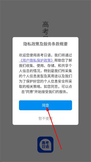 1、打開高考日語app,在彈出的隱私政策窗口中,點擊同意按鈕。