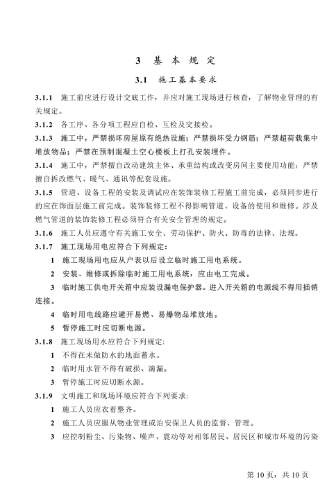 3.1.4 施工中,嚴(yán)禁擅自改動(dòng)建筑主體。承重結(jié)構(gòu)或改變房間主要使用功能;嚴(yán)禁擅自拆改燃?xì)狻⑴瘹?、通訊等配套設(shè)施。