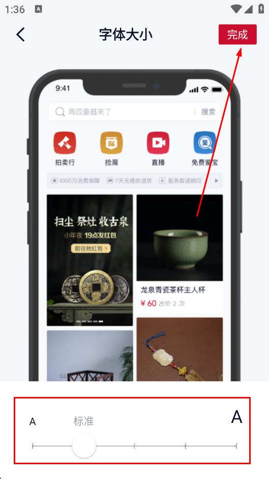 4、在字體大小設(shè)置界面,通過拖動下方的滑塊調(diào)整字體大小,點擊完成。