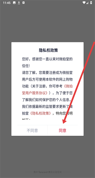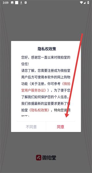 1、點擊“隱私權(quán)政策”彈窗的“同意”,進(jìn)入微拍堂登錄界面。