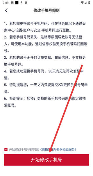 3、修改規(guī)則頁點擊“開始修改手機號”,進(jìn)入原手機號驗證界面。