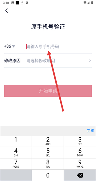 4、在原手機號驗證頁輸入原手機號碼,選擇修改原因,準(zhǔn)備提交申請。