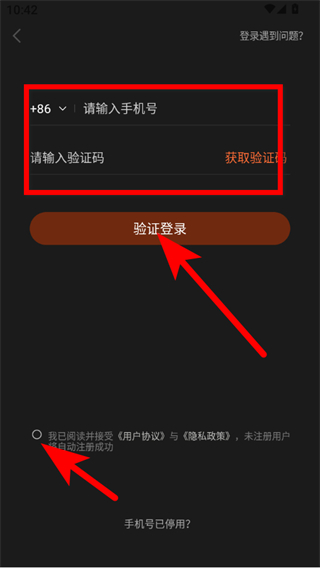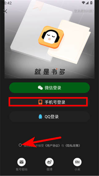 3、在登錄選擇頁(yè)面,點(diǎn)擊手機(jī)號(hào)登錄選項(xiàng),勾選用戶(hù)協(xié)議與隱私政策。
