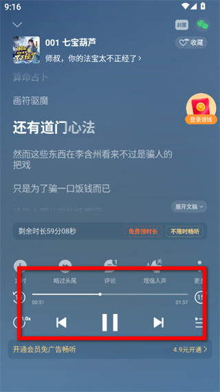 3、在聽(tīng)書(shū)界面,控制播放進(jìn)度,還能使用跳過(guò)、暫停等功能正常聽(tīng)書(shū)。