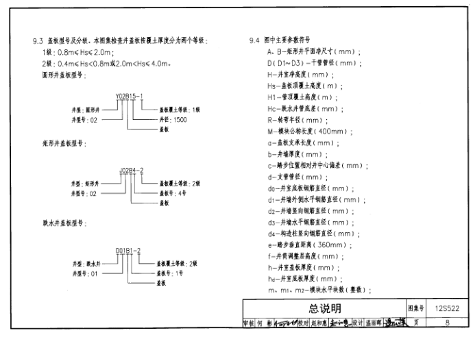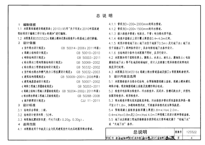 12s522圖集適用于市政及工業(yè)與民用建筑室外無內(nèi)壓的圓形排水管道。雨水管道管徑D=200~2000mm,污水管道管徑D=200~1500mm,檢查井蓋板以上設(shè)計(jì)覆土厚度在0.4~4.0m之間。結(jié)構(gòu)抗震設(shè)防烈度不大于8度(0.2g、0.30g)。矩形井按有地下水及無地下水兩種情況設(shè)計(jì),其余均按有地下水設(shè)計(jì)。