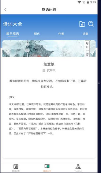 3、一鍵篩選不同成語(yǔ)提供海量精選的詞句和學(xué)習(xí)目標(biāo),每天在APP中背詩(shī)不斷提升記憶力。