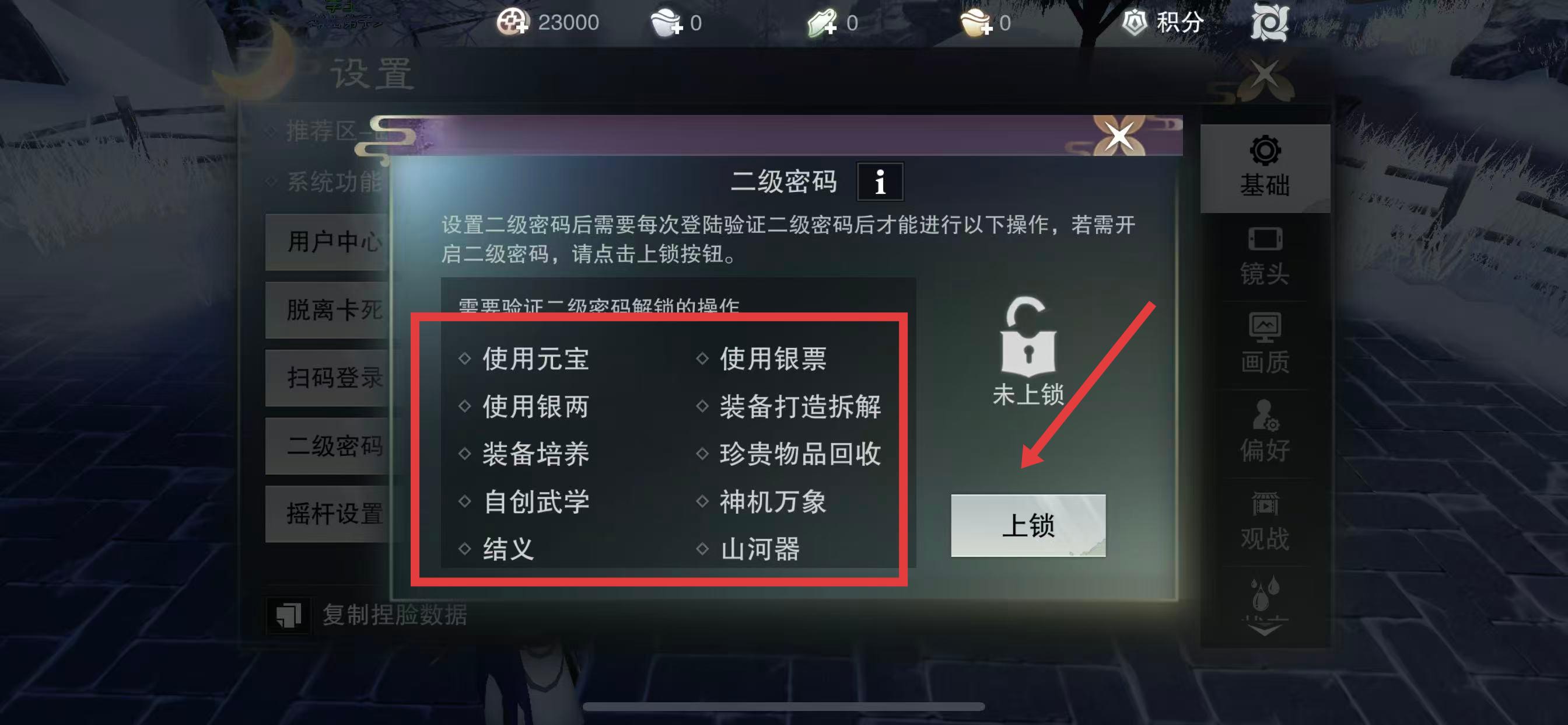 4、對使用元寶、銀兩、裝備打造拆解等操作進(jìn)行限制,點(diǎn)擊上鎖按鈕。