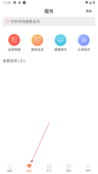 2、切換至服務(wù)頁(yè)面,利用手機(jī)號(hào)碼搜索會(huì)員,使用業(yè)績(jī)明細(xì)復(fù)購(gòu)會(huì)員等功能,為會(huì)員提供健康顧問(wèn)認(rèn)領(lǐng)服務(wù),管理會(huì)員信息,提升服務(wù)質(zhì)量。