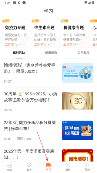 3、進(jìn)入學(xué)習(xí)頁(yè)面,選擇免疫力維生素骨健康等專題學(xué)習(xí),參與福利活動(dòng)領(lǐng)取家庭營(yíng)養(yǎng)手冊(cè),查看健康精選實(shí)用教程,了解新品積分挑戰(zhàn)湯幣清零等資訊。