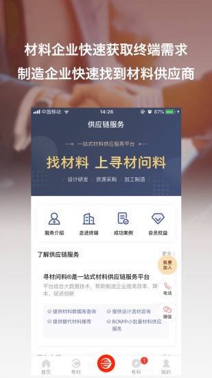 尋材問料app是一款為用戶打造材料解決一站式服務平臺。在線提供材料供應、采購、工藝、制造等,包含各個行業(yè)所使用的材料,全產(chǎn)業(yè)鏈的無縫交流互動平臺,打造材料行業(yè)最具創(chuàng)新服務能力的服務社區(qū),連接各行各業(yè)的精英!快來下載體驗吧!