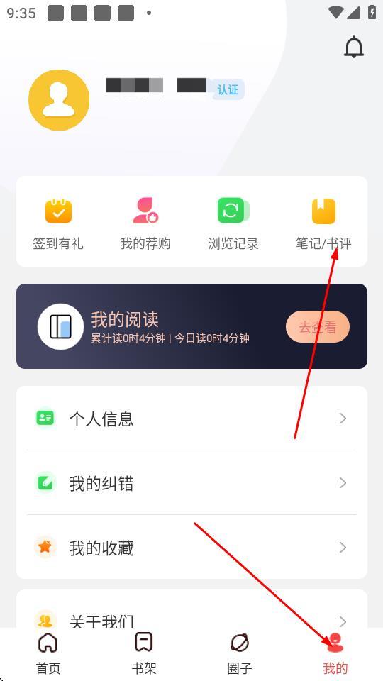 4、發(fā)表成功后,進入我的,再點擊筆記/書評選項。