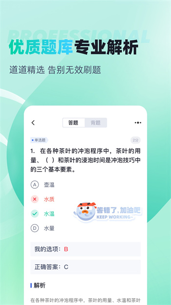 茶藝師題庫內(nèi)含考點(diǎn)練習(xí),通用卷以及地區(qū)卷模擬練習(xí),以及按照固定考試比重的隨機(jī)式的抽題的真題考場(chǎng),成績(jī)單實(shí)時(shí)記錄考試數(shù)據(jù),一點(diǎn)一滴的反饋考生近期學(xué)習(xí)狀態(tài)以及自我正確率的提升,給予考生通過考試的信心。