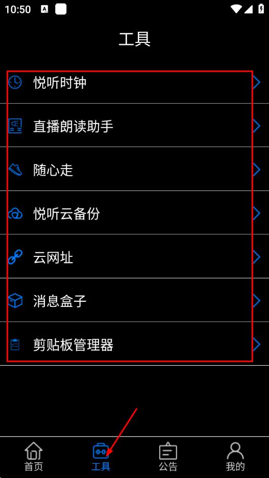 2、點(diǎn)擊底部導(dǎo)航欄中的工具選項(xiàng),進(jìn)入工具頁面,這里有悅聽時(shí)鐘、直播朗讀助手、隨心走等多種工具,點(diǎn)擊相應(yīng)工具即可使用。