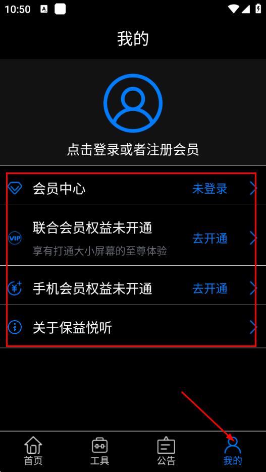 3、點(diǎn)擊底部導(dǎo)航欄中的我的選項(xiàng),如果需要開通會員權(quán)益,可以點(diǎn)擊會員中心、聯(lián)合會員權(quán)益未開通、手機(jī)會員權(quán)益未開通進(jìn)行開通操作,點(diǎn)擊關(guān)于保益悅聽了解應(yīng)用的相關(guān)信息。