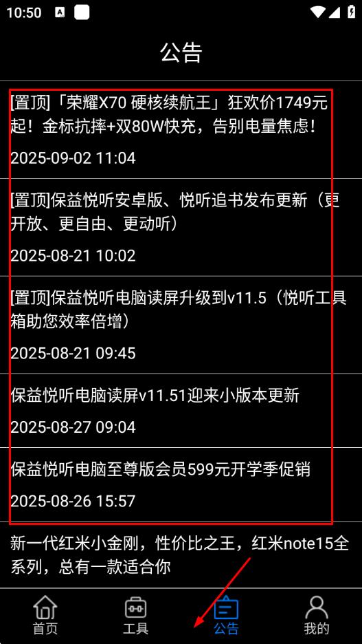 4、點(diǎn)擊底部導(dǎo)航欄中的公告選項(xiàng),進(jìn)入公告頁面,在這里可以查看保益悅聽發(fā)布的最新公告和版本更新等消息,以便及時(shí)了解應(yīng)用的動態(tài)和新功能。