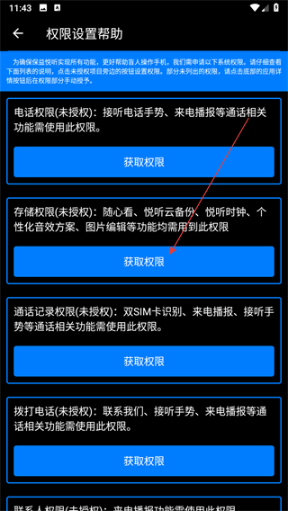 3、在權(quán)限設(shè)置幫助頁面找到存儲權(quán)限板塊,點(diǎn)擊其下方的獲取權(quán)限按鈕。