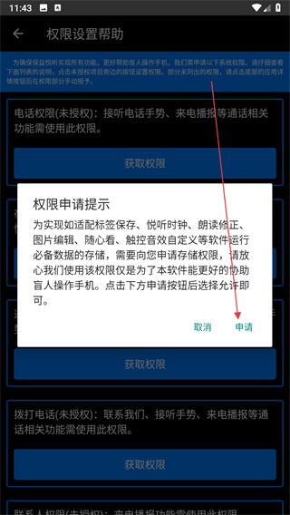4、在權(quán)限申請?zhí)崾究蛑悬c(diǎn)擊申請按鈕,按照系統(tǒng)提示完成存儲權(quán)限的授予。