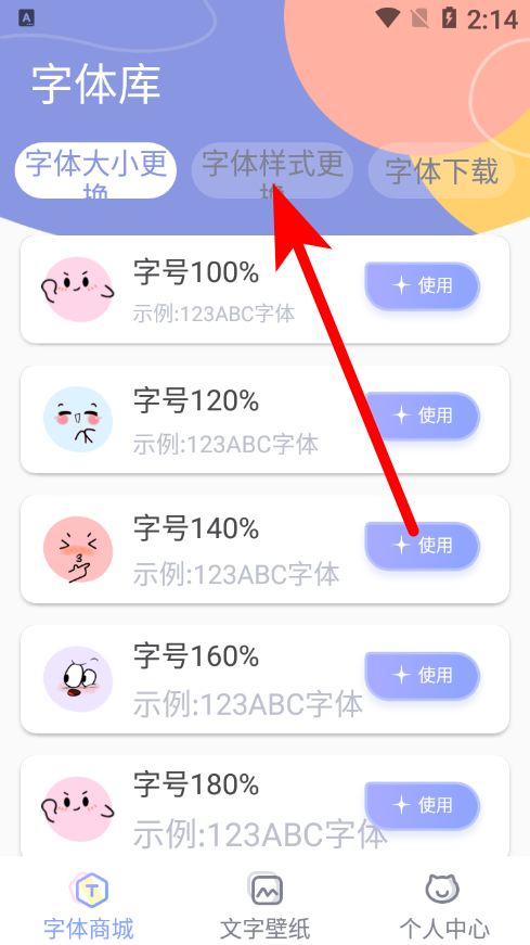 1、在字體庫頁面,點(diǎn)擊字體樣式更換選項(xiàng),進(jìn)入字體樣式列表界面。