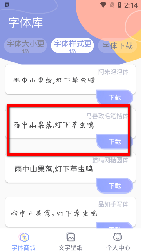 2、在字體樣式列表界面,選擇要下載的字體如馬善政毛筆楷體,點(diǎn)擊下載按鈕。
