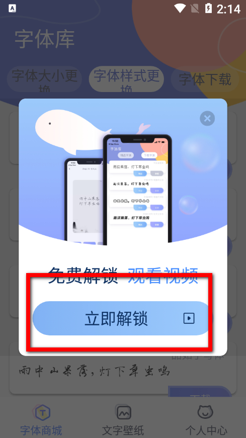 3、在彈出的解鎖界面,點(diǎn)擊立即解鎖按鈕,觀看視頻后即可完成字體下載操作。