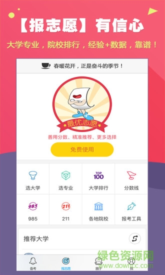 智能推薦高考志愿,百萬(wàn)量級(jí)數(shù)據(jù)庫(kù)支持,歷年分?jǐn)?shù)志愿錄取情況支持,大數(shù)據(jù)時(shí)代貼心推薦適合你的高考志愿;選大學(xué),選專(zhuān)業(yè),各大院校排行,讓你清晰各個(gè)大學(xué)的優(yōu)劣勢(shì),報(bào)考更有譜;各地歷年分?jǐn)?shù)線(xiàn),各地院校詳情介紹,詳細(xì)到想不到!高考幫-貼心為你的手機(jī)志愿填報(bào)專(zhuān)家。