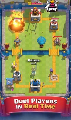《Clash Royale》在玩法上加入了防御塔的設(shè)定、卡牌和卡牌升級(jí),還加入了雙線攻防的RTS元素。在游戲模式上,《Clash Royale》只有在線實(shí)時(shí)對(duì)戰(zhàn)模式,目前實(shí)時(shí)匹配模式是1V1,玩家們消耗金幣進(jìn)行在線匹配對(duì)戰(zhàn),雙方各有3個(gè)防御塔,摧毀弓箭防御塔可以得到1個(gè)皇冠,直接摧毀國(guó)王炮塔可以獲得3個(gè)皇冠。在3分鐘的時(shí)間限制下,最先拿到3個(gè)皇冠或者獲得皇冠數(shù)最多的玩家獲勝,若雙方平手的話,可以獲得1分鐘的額外加時(shí),如果最后還是平手,那么此次對(duì)戰(zhàn)則為平局,雙方都得不到獎(jiǎng)杯。