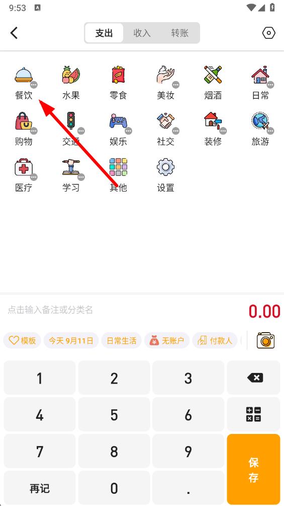 2、在記賬界面,選擇消費或收入類別,比如點擊餐飲。