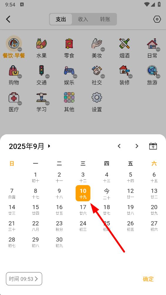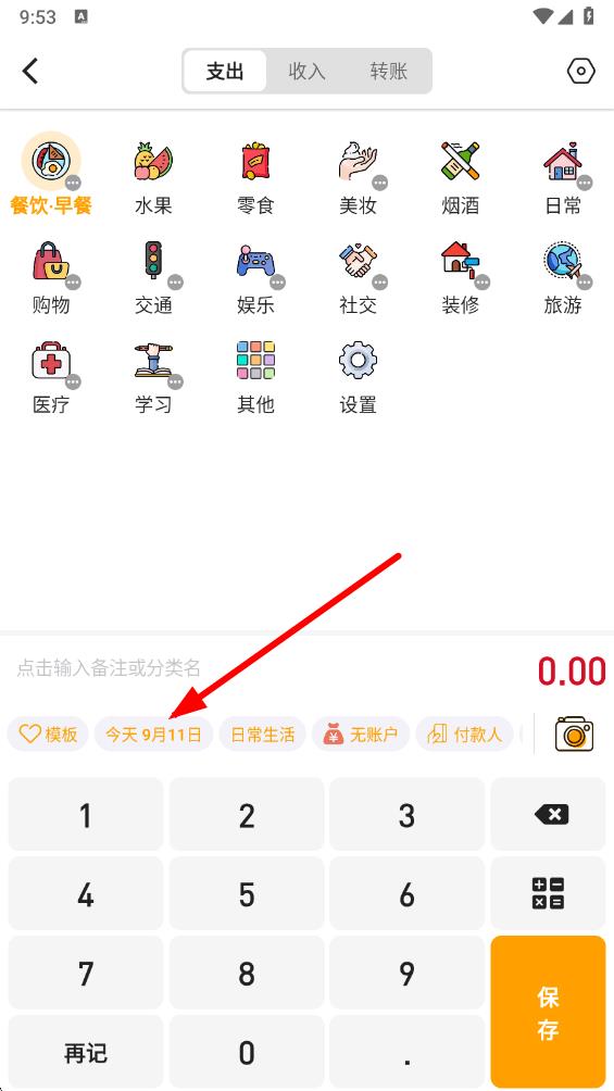 3、點擊記賬界面下方顯示日期的位置,此時會彈出日期選擇窗口。