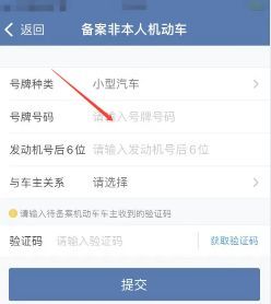 6、輸入要備案的非本人機(jī)動(dòng)車(chē)車(chē)牌號(hào)碼和發(fā)動(dòng)機(jī)號(hào)后六位,然后選擇跟車(chē)主的關(guān)系,獲取驗(yàn)證碼,提交等待審核即可!