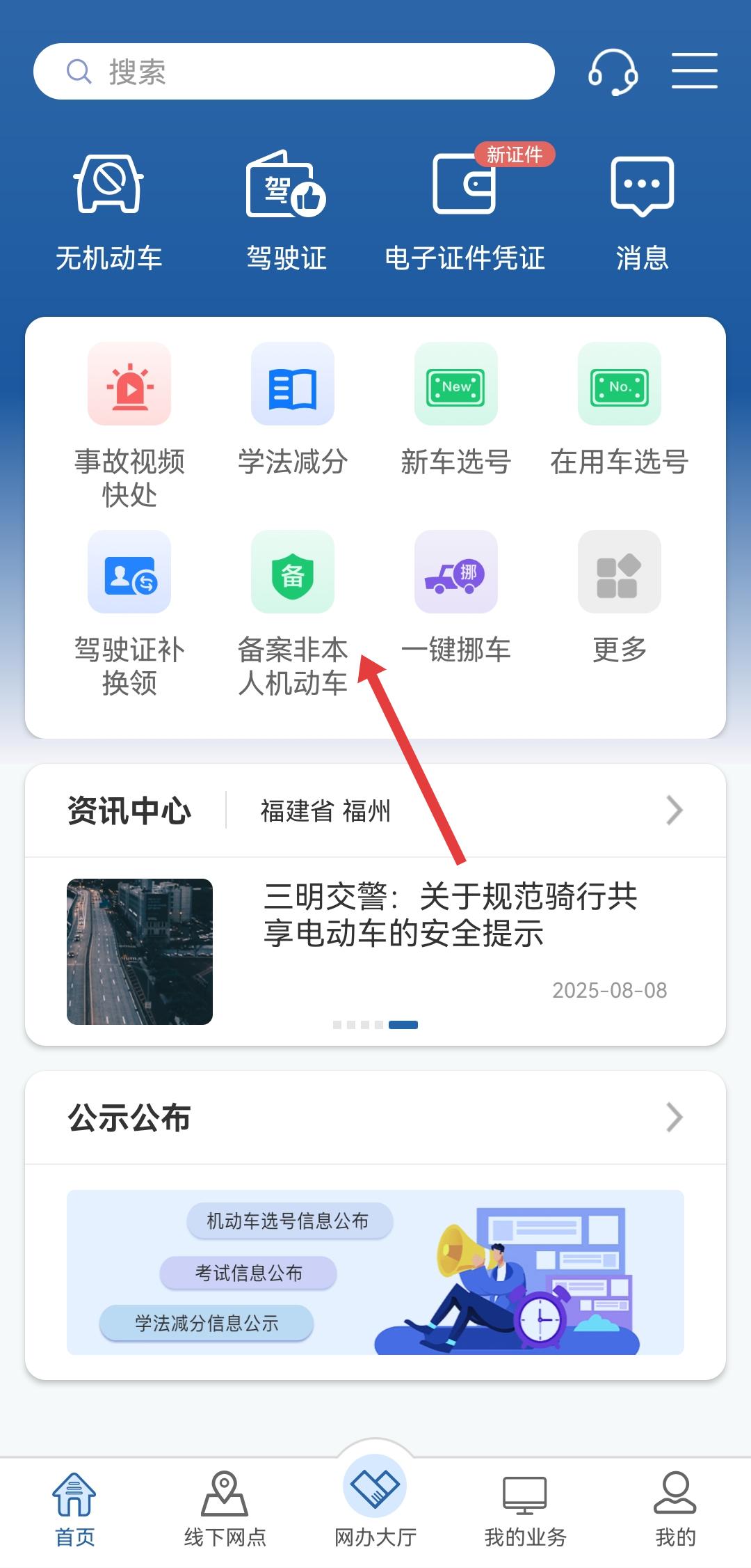 1、需要打開(kāi)交管12123APP首頁(yè),然后找到并點(diǎn)擊備案非本人機(jī)動(dòng)車(chē)的選項(xiàng),進(jìn)入備案的流程。