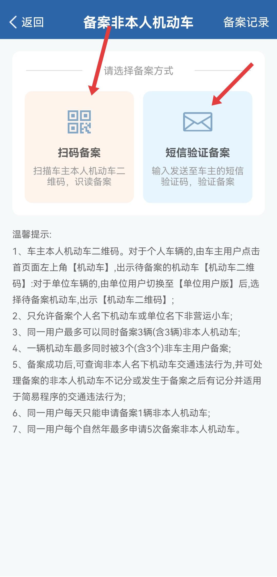 2、在備案非本人機(jī)動(dòng)車(chē)頁(yè)面,可以選擇備案方式掃碼備案或短信驗(yàn)證備案,按照提示進(jìn)行操作。